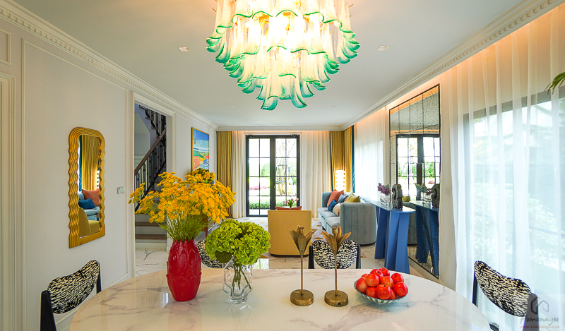 ห้องนั่งเล่นอีกจุดจะอยู่โซนด้านในจัดไว้เป็นมุมสำหรับครอบครัว โดนพื้นที่จะเปิดโล่งแนวยาวเชื่อมต่อกับส่วนรับประทานอาหารขนาดใหญ่ วางโต๊ะรับประทานอาหารขนาด 8-10 ที่นั่งได้สบาย ๆ และยังแบ่งพื้นที่ทำเป็นเคาน์เตอร์ส่วนเตรียมอาหาร เป็นครัวฝรั่ง หรือบาร์เครื่องดื่มก็ได้