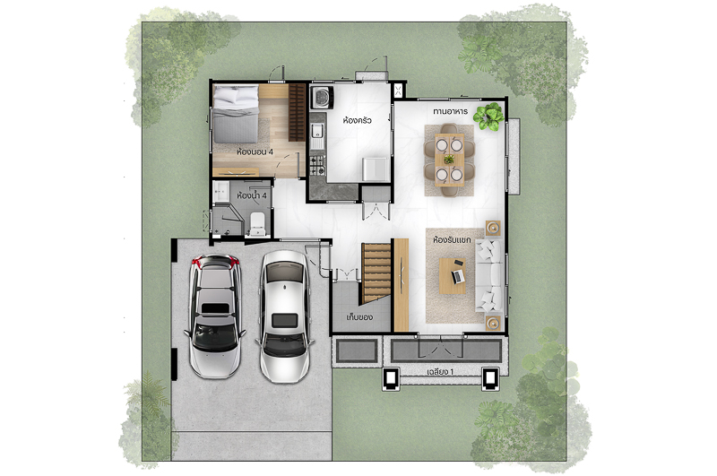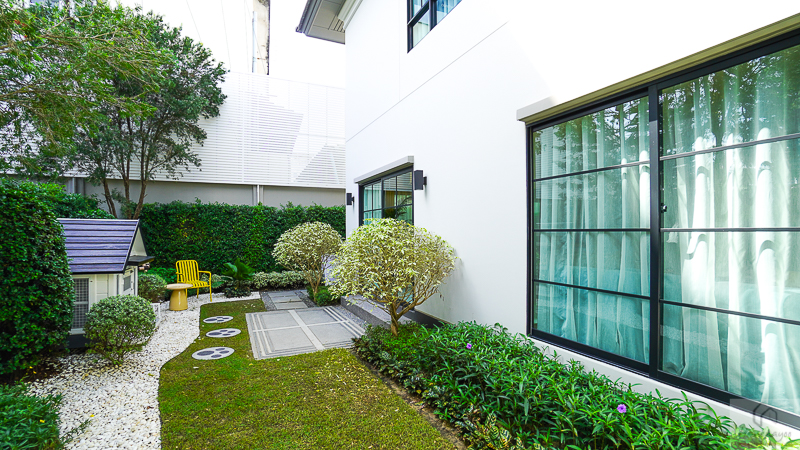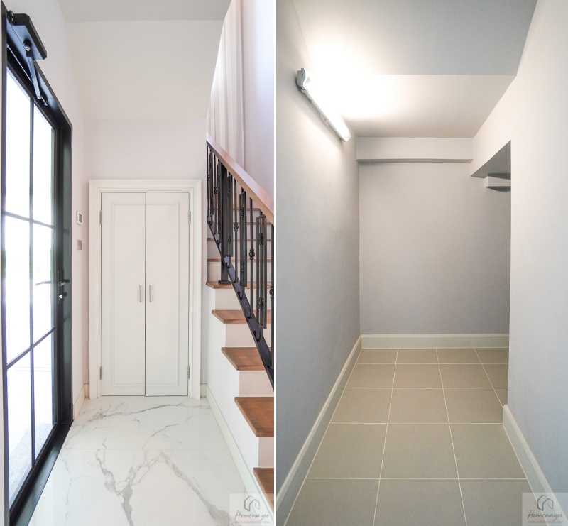 ฝั่งด้านข้างจะเป็นห้องน้ำ ตู้เก็บของ และประตูกระจกเปิดเชื่อมออกไปยังที่จอดรถ ซ้ายมือเป็นประตูห้องครัว