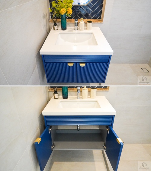 ได้อ่างล้างมือของ Kohler ฝังท็อปเคาน์เตอร์มาให้เรียบร้อย มีพื้นที่วางของรอบอ่าง ใต้อ่างมีตู้เก็บของเป็นบานเปิด 2 บาน หน้าบานตู้จะได้ตามนี้เลย ที่ผนังทำเป็น Low wall ยาวตลอดแนวไว้วางของได้อีก