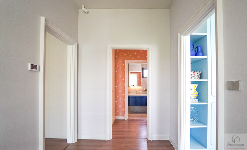 พื้นที่หน้าห้องน้ำทำเป็นห้องแต่งตัว วางตู้เสื้อผ้าขนาดใหญ่ และชั้นวางของมาให้ดู