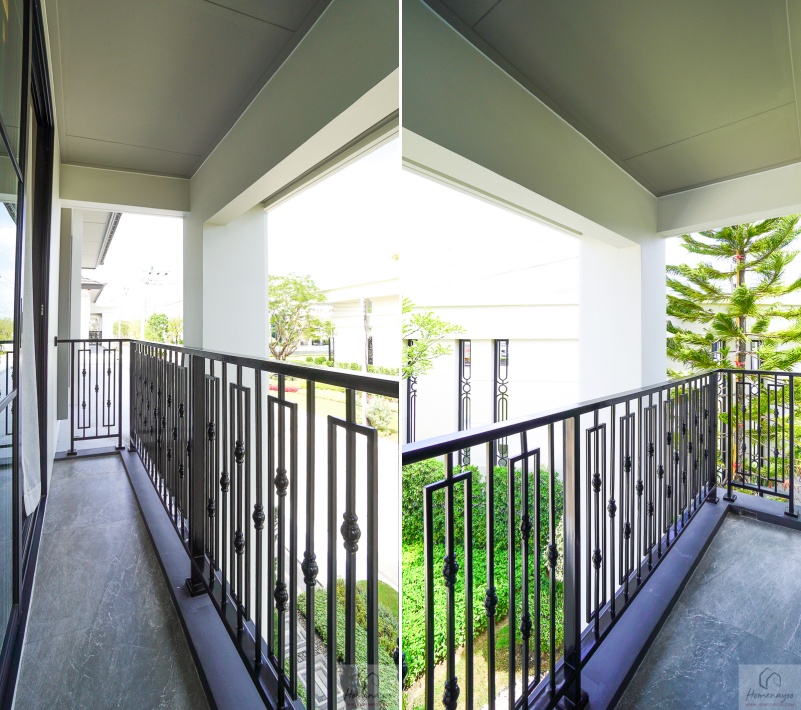 ฝั่งด้านหน้าเป็นระเบียงมีประตูกระจกบานเลื่อนเปิดเชื่อมออกไปได้