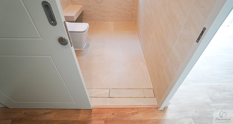 ระดับพื้นในห้องน้ำจะเรียบเสมอกับพื้นบ้าน และทำ Floor Drain ยาวเท่าแนวประตู เวลาเดินเข้าออก ไม่ต้องกลัวสะดุด และรองรับการใช้งานรถเข็น ประตูห้องน้ำได้แบบบ้านเลื่อน ช่วยให้ใช้งานได้สะดวก