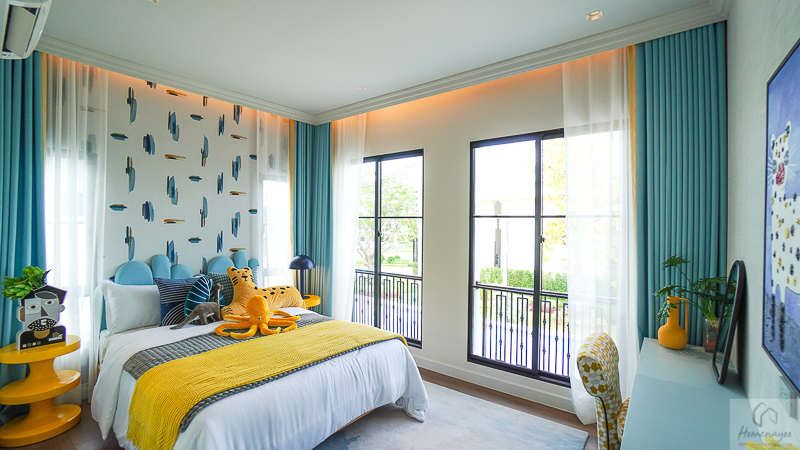 ถัดมาห้องนอน 2 ตำแหน่งจะอยู่มุมหน้าบ้านอีกฝั่ง ภายในมีพื้นที่มาให้พอสมควร วางเตียง 5-6 ฟุตได้สบาย ๆ