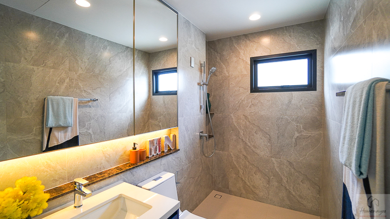 ภายในห้องน้ำแบ่งส่วนเปียกส่วนแห้ง พื้นและผนังตกแต่งด้วยกระเบื้องแกรนิตโต้โทนสีดูสบายตา ได้ชุดตู้ตามนี้เลย อ่างล้างมือได้ของ Kohler และโถสุขภัณฑ์ของ Cotto มีช่องแสงในห้องน้ำเป็นบานกระทุ้งเปิดระบายอากาศได้
