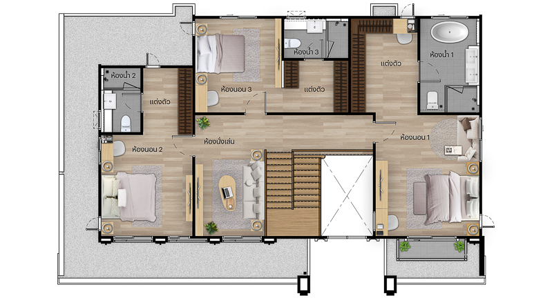 มองกลับไปฝั่งด้านในจะแบ่งเป็นห้องนอน 4 ห้อง ซ้ายมือเป็น Master Bedroom ขวามือเป็นห้องนอน 2 ตรงกลางเป็นห้องนอน 3 และห้องนอน 4