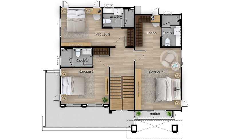 ห้องนอน 3 ตำแหน่งอยู่โซนหลังบ้าน ได้พื้นที่ในห้องกว้างพอสมควร วางเตียงนอน 5-6 ฟุตได้ พร้อมโต๊ะข้างเตียง มีพื้นที่เหลือรอบ ๆ ในห้องนอนมีช่องแสง 2 ฝั่ง สามารถเปิดระบายอากาศได้สะดวก