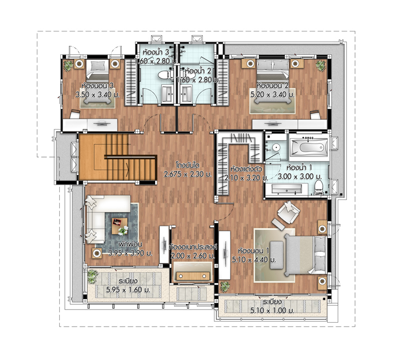 พื้นที่ใช้สอย 165 ตร.ม. ประกอบด้วย 3 ห้องนอน , 3 ห้องน้ำ , 1 ห้องรับแขก ,