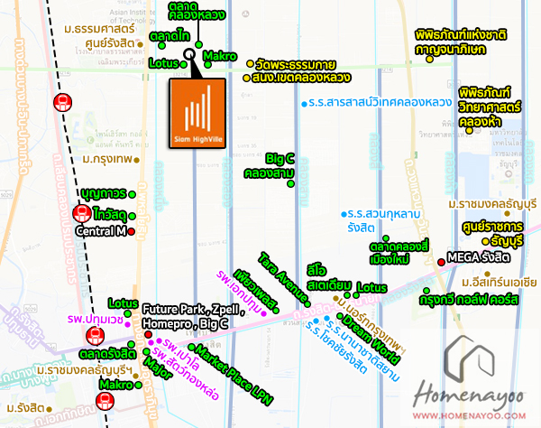 | สถานที่สำคัญใกล้เคียง | – สถานศึกษา : รร.ไทยรัฐ, ม.ธรรมศาสตร์, ม.กรุงเทพ- ห้างสรรพสินค้า : ตลาดไท, ฟิวเจอร์ปาร์ค รังสิต, บิ๊กซี, โลตัส, แม็คโคร, เมกาโฮม นวนคร, บุญถาวร, TU โดมพลาซ่า- โรงพยาบาล : รพ.ภัทร-ธนบรี, รพ.ธรรมศาสตร์ |