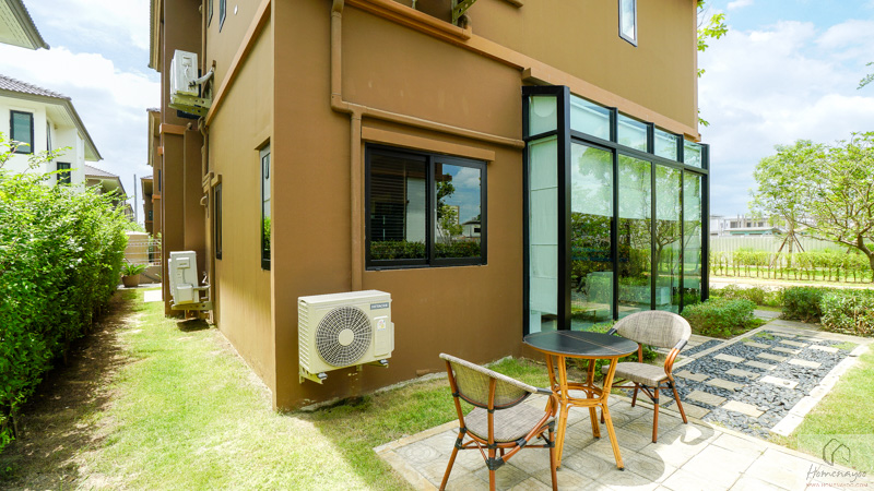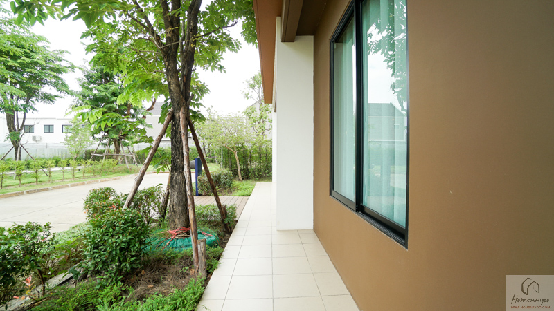 พื้นที่ใช้งานเป็นแบบหน้ากว้าง เหมาะกับการออกมายืนรับลมชมวิวสวน หรือใครจะปลูกต้นไม้กระถาง จัดสวนสวยเล็ก ๆ บริเวณนี้ก็ดีเหมือนกัน