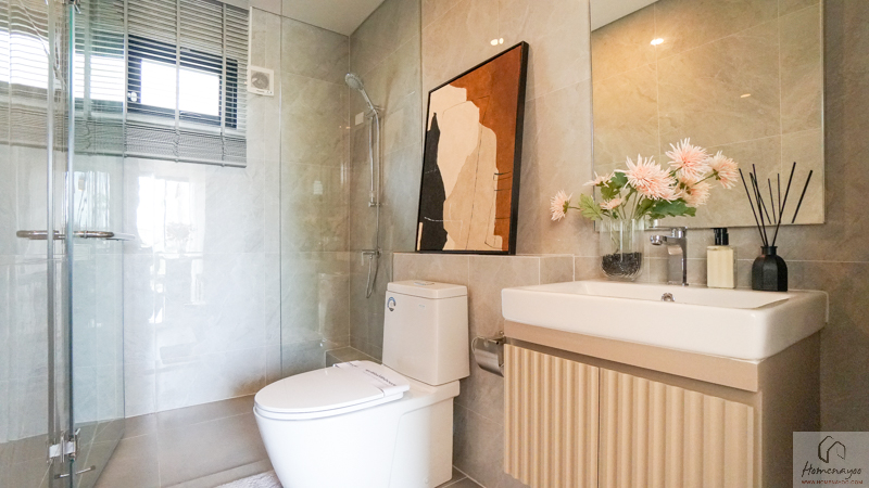 ห้องน้ำแบ่งส่วนแห้ง แยกส่วนอาบน้ำ และได้ฟังก์ชัน รวมถึงสุขภัณฑ์ต่าง ๆ เหมือนกันกับห้องน้ำในห้องนอน 2 เลยค่ะ