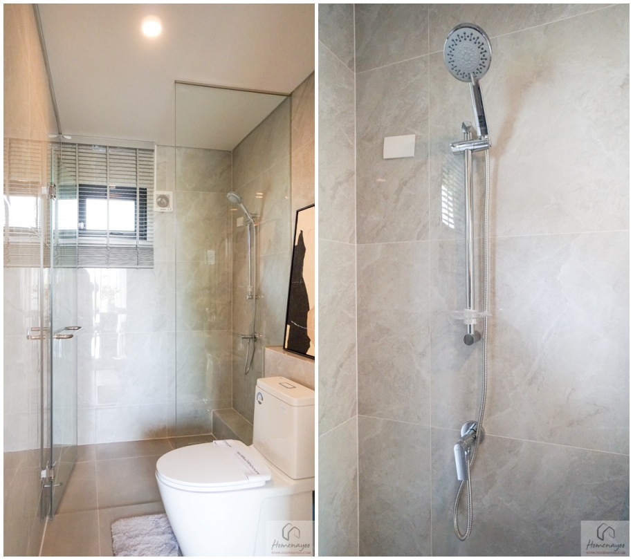 ขวามือติดกันเป็นส่วนอาบน้ำ กั้นแยกส่วนด้วย Shower Screen ภายในติดฝักบัวให้ 2 แบบเลย ทั้ง Rain Shower และ Hand Shower และห้องนี้จะเป็นห้องเดียวที่ได้ก๊อกผสมน้ำร้อน-น้ำเย็น