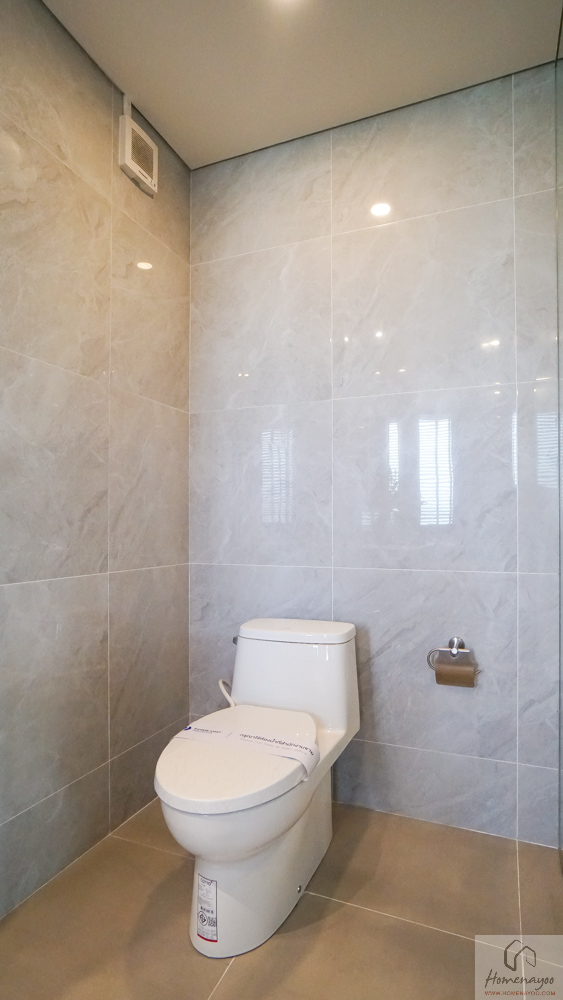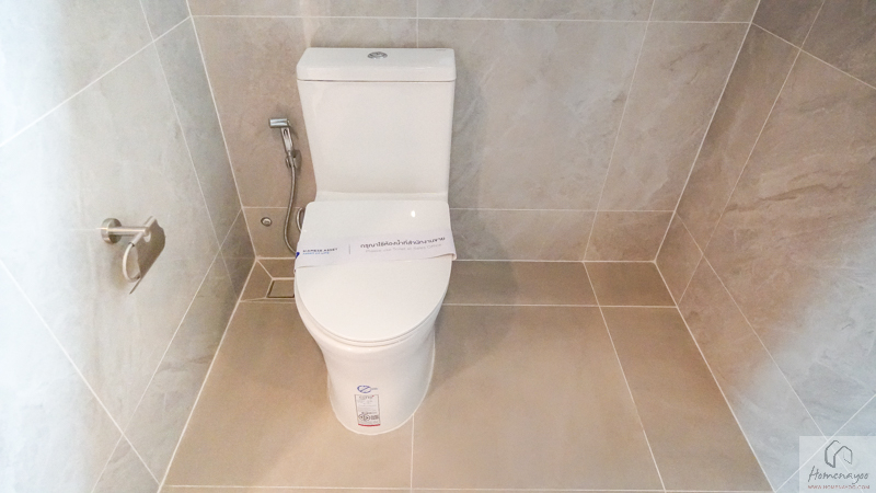 อีกฝั่งได้โถสุขภัณฑ์กึ่งอัตโนมัติ พร้อมอุปกรณ์ประกอบครบเซ็ต และที่ผนังซ้ายมือจะมีพัดลมระบายอากาศติดมาให้ 1 ตัว