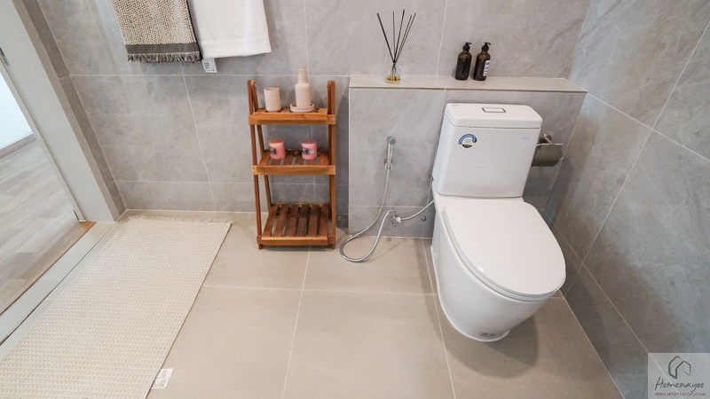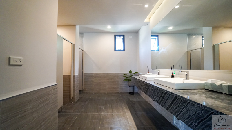 เข้าไปดูห้องน้ำชั้นล่างกันค่ะ เราจะเห็นว่าด้านหน้าจะมี Corner เล็ก ๆ ให้วางตู้เก็บของ หรือจะ Built-in ตู้และชั้นวางของแบบบ้านตัวอย่างก็ได้นะ