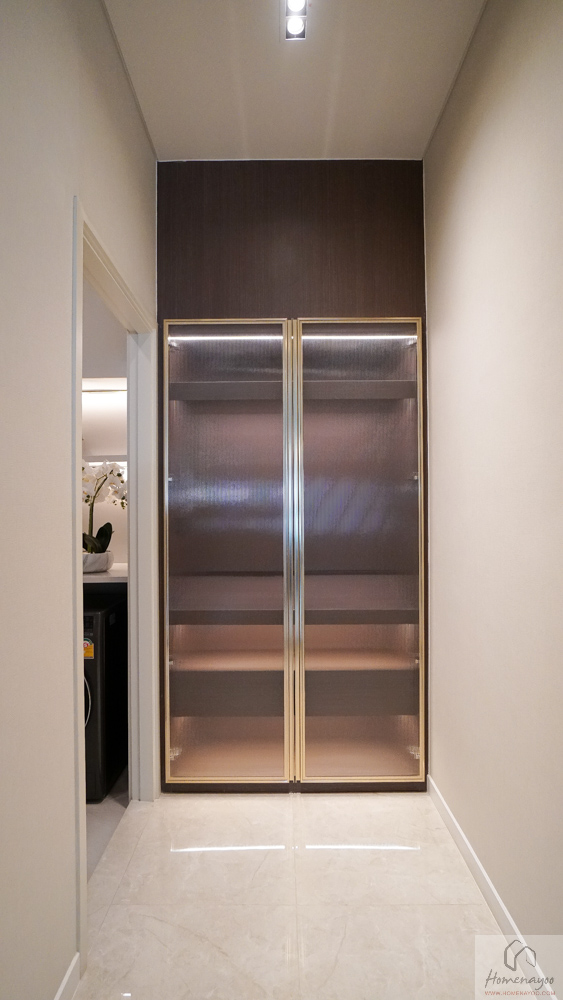 สุดโถงทางเดิน ด้านหน้าทางเข้าห้องซัก-อบผ้า จะมีพื้นที่เว้นลงไปให้ Built-in ตู้วางรองเท้าแนวสูงแบบนี้ได้ หรือใครจะวางเป็นเฟอร์นิเจอร์ลอยตัวอื่น ๆ ก็ทำได้ตามต้องการค่ะ