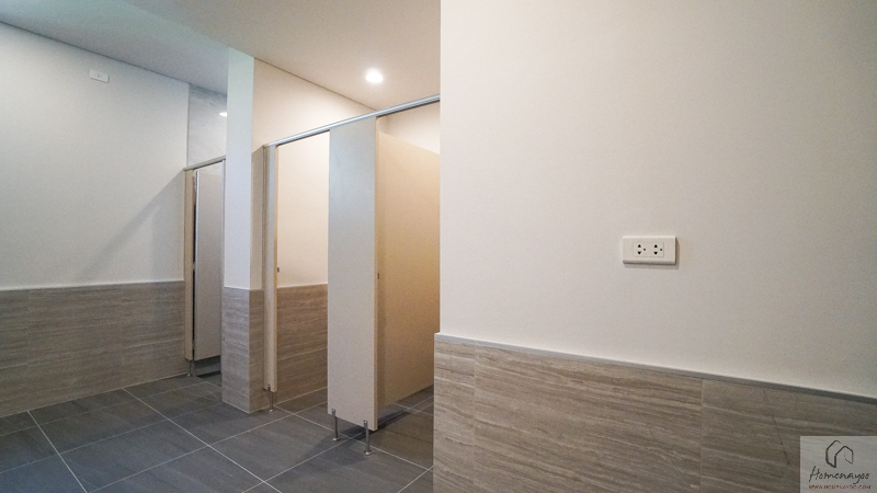 ภายในได้พื้นที่มากว้างขวาง ตกแต่งกระเบื้องคุมโทนสีเทา ส่วนพื้นใช้เป็นผิว Matt กันลื่นได้ดีค่ะ สุขภัณฑ์มาตรฐานติดมาให้ตามภาพ มีตัวช่วยในการระบายอากาศเป็นหน้าต่างกระจกฝ้าบานกระทุ้งและมีพัดลมระบายอากาศให้ 1 ตัว ค่ะ