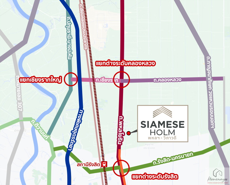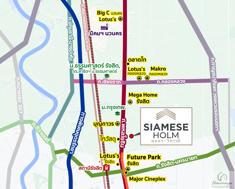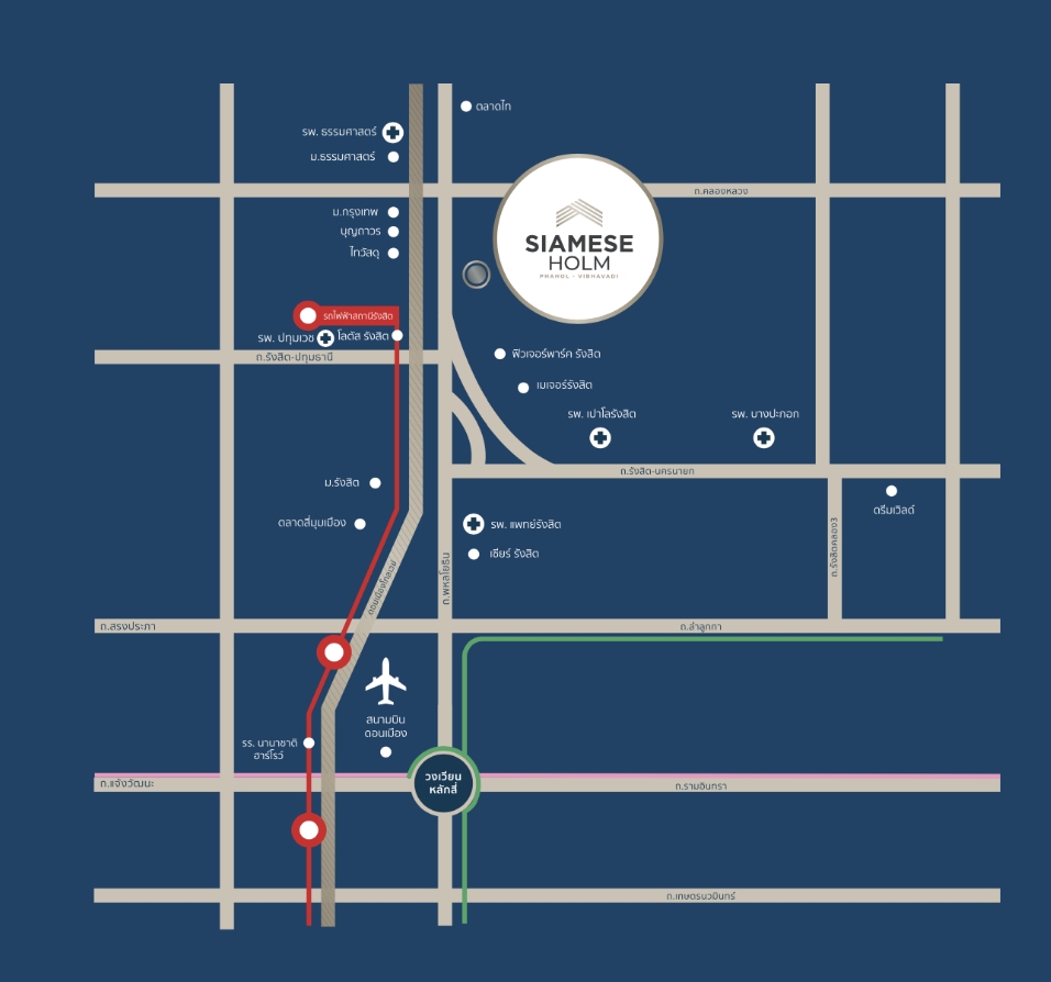 สำหรับโครงการ Siamese Holm พหลฯ-วิภาวดี จะอยู่ในทำเลรอบนอกของกรุงเทพฯ ในโซนรังสิต-ปทุมธานี ที่มีความอดมสมบูรณ์สูง เนื่องจากมีสถานที่ทำงาน โรงงานอุตสาหกรรม บริษัทเอกชน รวมถึงมหาวิทยาลัยชั้นนำของไทยตั้งอยู่เยอะ