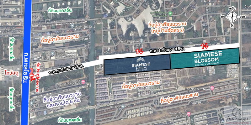 ภาพมุมสูงโครงการ Siamese Holm พหลฯ-วิภาวดี ตั้งอยู่บนที่ดินผืนใหญ่ของ Siamese Asset ซึ่งจะใช้ซุ้มประตูด้านหน้า และถนนภาระจำยอมร่วมกันรวม 2 โครงการ คือ โครงการ Siamese Holm โครงการบ้านเดี่ยว 2 ชั้น ที่เรารีวิวในวันนี้ และอีก 1 โครงการ คือ Siamese Blossom ที่เป็นโครงการประเภททาวน์โฮมและบ้านแฝด 2 ชั้น ซึ่งทั้ง 2 โครงการ จะแยกซุ้มประตูและนิติบุคคลจากกันอย่างชัดเจน