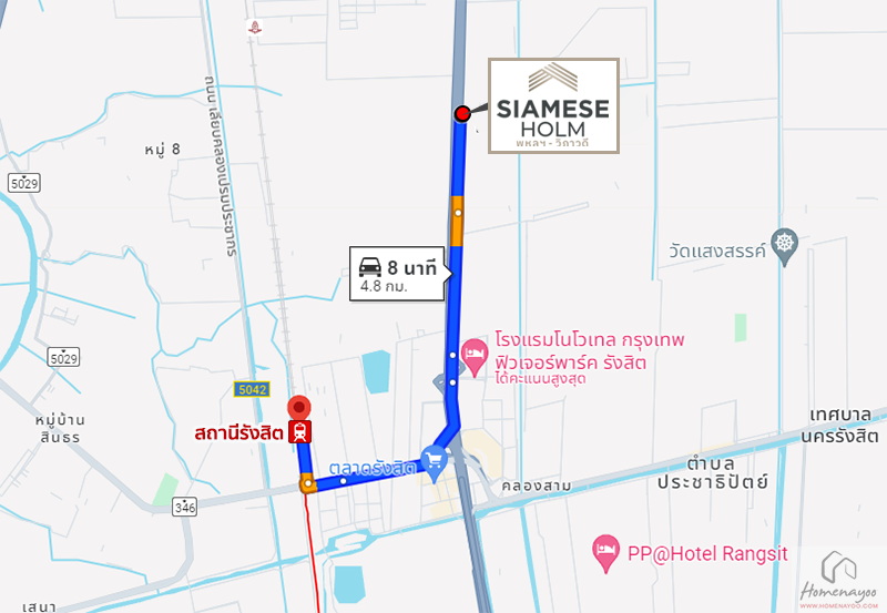โครงการอยู่ใกล้กับรถไฟฟ้าสายสีแดงเข้ม สถานีรังสิต เพียง 4.8 กม.* หรือใช้เวลาเดินทางไปราว ๆ 8 นาที*