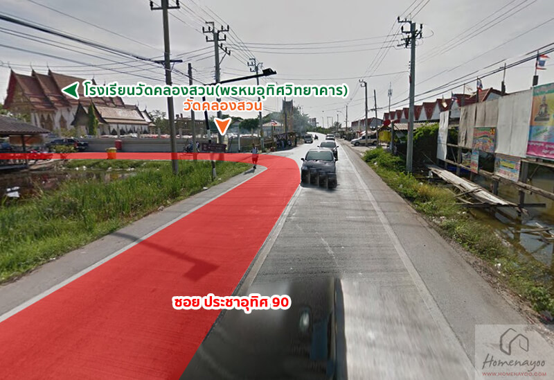 *จุดสังเกตผ่านซ้ายมือ หมู่บ้านศวรรยา 2, ขวามือเป็น พฤกษ์ลดา ประชาอุทิศ 90, อินดี้ ประชาอุทิศ 90, เคหะแห่งชาติ เอื้ออาทร บ้านคลองสวน, ไลบรารี่ ทาวน์ (Library Town)