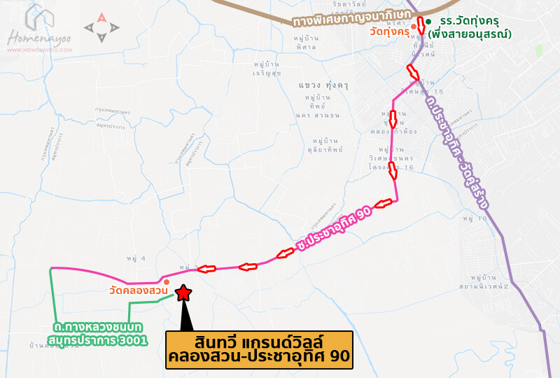 การเดินทาง ผมเริ่มจาก ถนนประชาอุทิศ มุ่งหน้าไปทางใต้ (หน้าโรงเรียนวัดทุ่งครุ) ⇒ เลี้ยวขวาเข้าสู่ ซอยประชาอุทิศ 90 ⇒ บ้านแฝดสินทวี แกรนด์วิลล์ คลองสวน-ประชาอุทิศ 90 *โครงการอยู่ใกล้ วัดคลองสวน