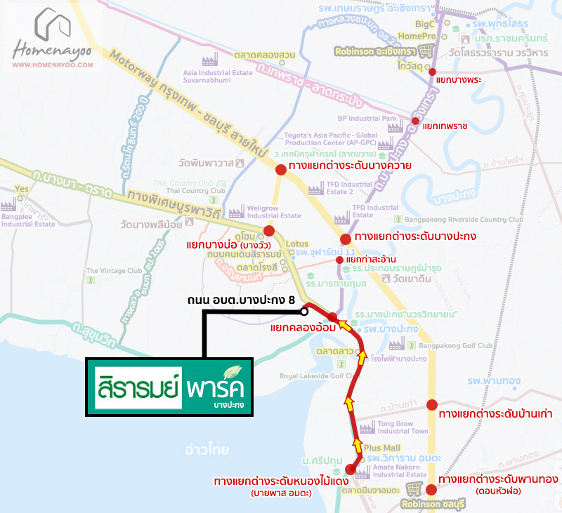 จากปากซอยตรงไปประมาณ 240 ม.ถึงโครงการสิรารมย์ พาร์ค บางปะกง ติดกันเป็นโครงการ M Village บางปะกง