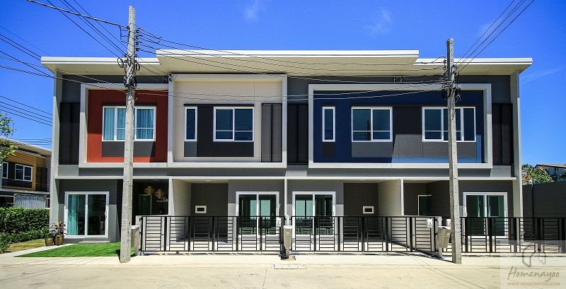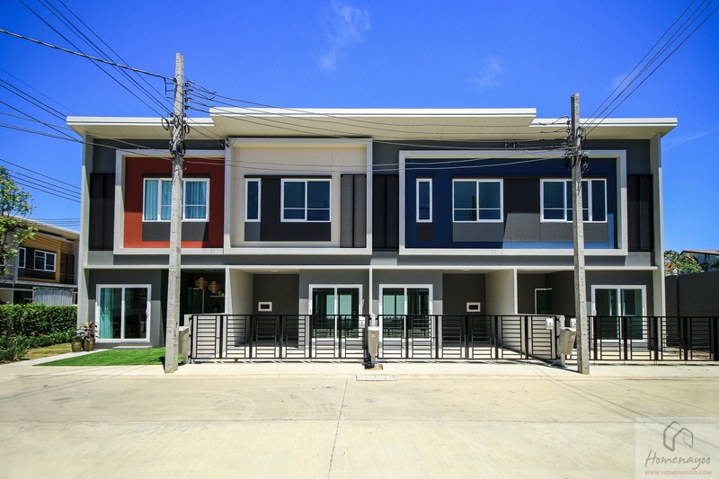 ⇒ แบบบ้านและวัสดุ : แบบบ้านของโครงการนี้ เป็นทาวน์โฮม 2 ชั้น หน้ากว้างมาตรฐาน 5.2-5.5 เมตร ออกแบบบ้านในสไตล์ Modern Loft ด้วยสีสันสดใส แดงอิฐ ครีม น้ำเงิน เหลือง พร้อมเพิ่มมิติให้ตัวบ้านด้วยบัวผนังสีขาว และ Facade ระแนงเหล็กฉีกสีดำ