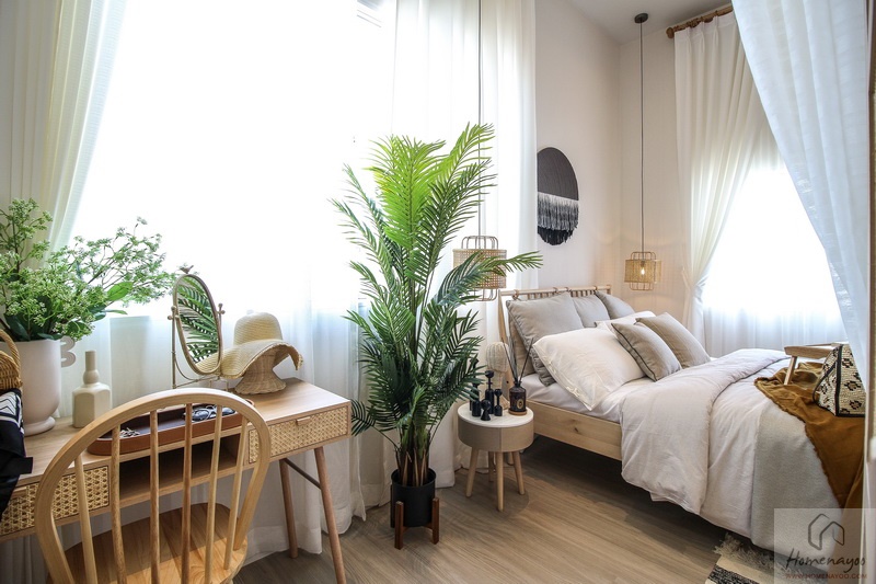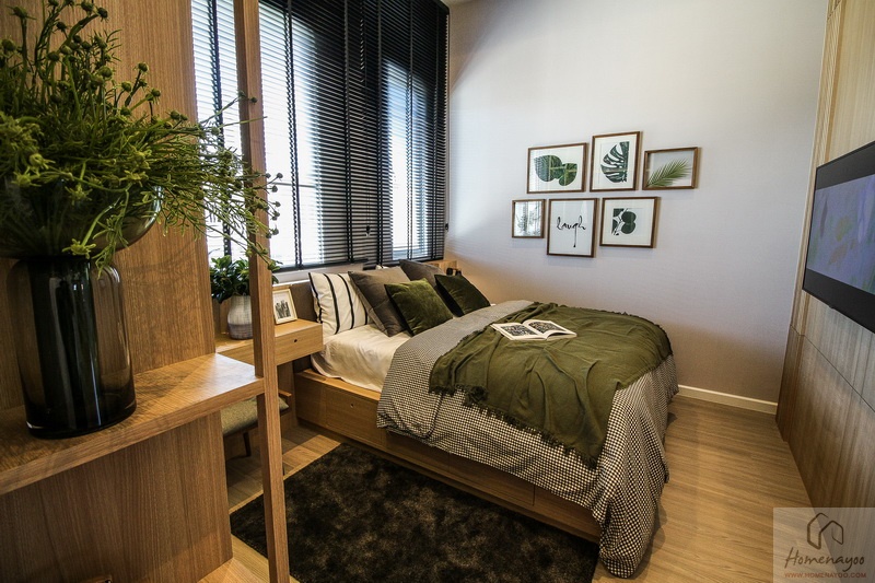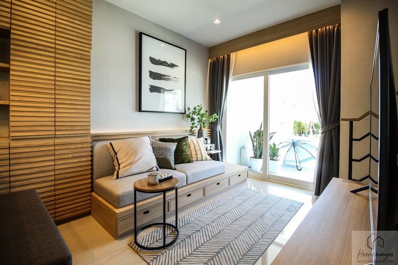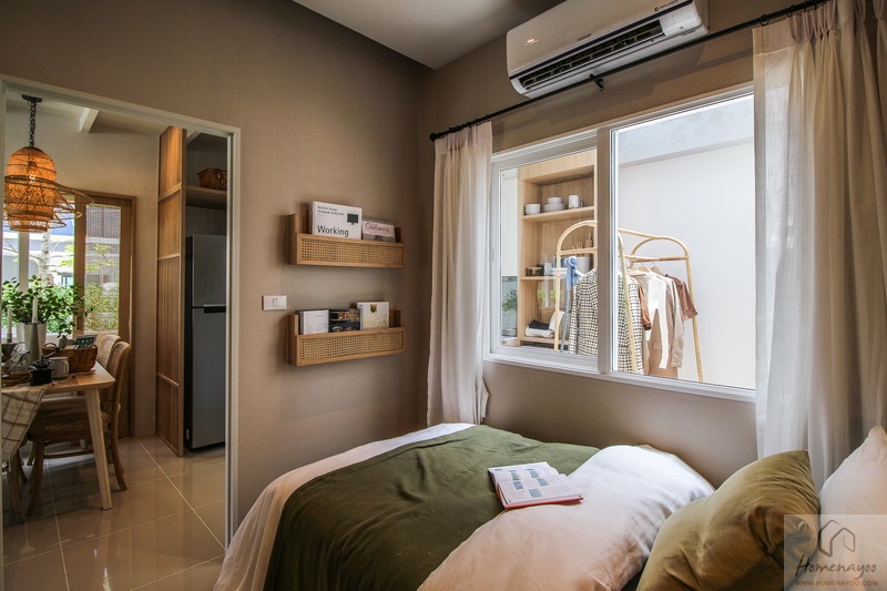 เข้ามาที่ด้านในห้องนอน 2 บ้านตัวอย่างตกแต่งเป็นห้องทำงานให้ดูเป็นไอเดีย สามารถจัดวางเฟอร์นิเจอร์ Full Function ได้ครบชุด ทั้งโต๊ะทำงานตัวยาว ที่รองรับได้ 1-2 คน, ชั้นวางของ และ ตู้เก็บของแนวสูง รวมถึงจัดมุมพักผ่อนด้วยการวาง Sofa bed ชิดผนังห้อง ส่วนห้องจริงสามารถวางเตียงนอน 3.5 ฟุต และ เฟอร์นิเจอร์มาตรฐานได้ครบเซ็ตเช่นเดียวกันค่ะ