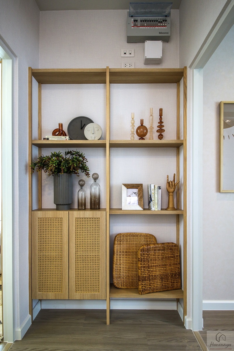 ตรงข้ามโซฟาจะเป็นพื้นที่สำหรับวางทีวี บ้านตัวอย่างบิวท์อิน Sideboard และ แต่งผนังไม้สีบีชมาให้ดูเป็นไอเดีย บ้านจริงจะเป็นผนังเปล่า ความกว้าง ประมาณ 1.6 เมตร เลือกได้ตามชอบเลย ว่าจะวางเฟอร์นิเจอร์แบบลอยตัว หรือ บิวท์อิน ผนังด้านหลังเดินงานระบบไฟฟ้า, เต้าเสียบปลั๊กไฟ, ช่องเสียบสายเคเบิล และ ช่องเสียบโทรศัพท์มาให้เรียบร้อย