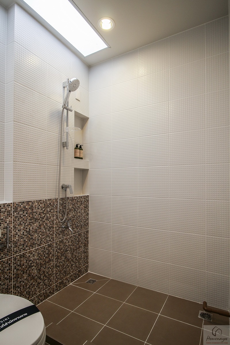 ถัดเข้าไปเป็นส่วนอาบน้ำ ทำพื้นลดระดับลงมาจากส่วนแรก ประมาณ 10 ซม. เพื่อกันน้ำไหลย้อนกลับ จุดนี้จะติดฝักบัว Hand Shower พร้อมราวปรับระดับ + ที่วางสบู่ ก๊อกน้ำโครเมียมก้านโยก พร้อมเดินงานระบบรองรับการติดตั้งเครื่องทำน้ำอุ่นให้เรียบร้อย