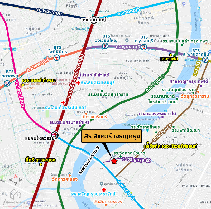 การเดินทาง ผมเริ่มจาก ถนนกรุงธนบุรี มุ่งหน้าไปทาง ตะวันตก (หน้า BTS วงเวียนใหญ่) ⇒ เลี้ยวซ้ายเข้าสู่ ถนนสมเด็จพระเจ้าตากสิน ⇒ เลี้ยวซ้ายเข้าสู่ ถนนพระราม 3 ⇒ เลี้ยวซ้ายเข้าสู่ ถนนเจริญกรุง ⇒ เลี้ยวซ้ายเข้าสู่ ซอยเจริญกรุง 80 ⇒ สิริ สแควร์ เจริญกรุง *โครงการอยู่ภายใน ซอยเจริญกรุง 80