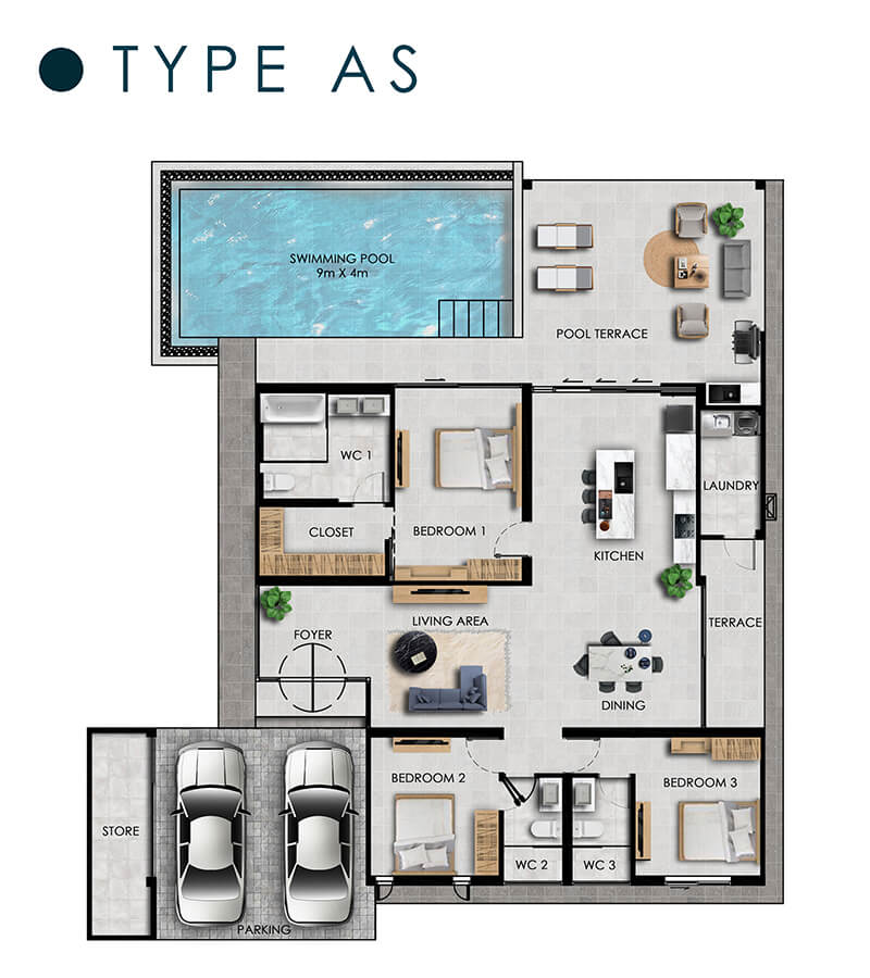 • ฟังก์ชันบ้าน 3 ห้องนอน, 3 ห้องน้ำ, 2 ที่จอดรถ พร้อมสระว่ายน้ำ