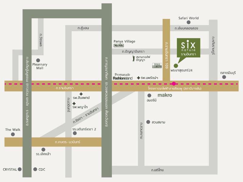 ทำเลที่ตั้งโครงการ – โครงการ Sixnature รามอินทรา ตั้งอยู่ในซอยพระยาสุเรนทร์ 24 ปากซอยเป็นถนนพระยาสุเรนทร์ซึ่งเชื่อมกับถนนรามอินทราและถนนปัญญาอินทรา อยู่ไม่ไกลจากทางขึ้น-ลงทางด่วน ใกล้ตลาดสด, ตลาดนัด ร้านมินิมาร์ท สองข้างทางมีร้านค้า ร้านอาหารตลอดเส้นทาง ไปยังห้างสรรพสินค้าอย่าง Fashion Island, The Promenade, BigC, Lotus และสวนสยามได้สะดวก