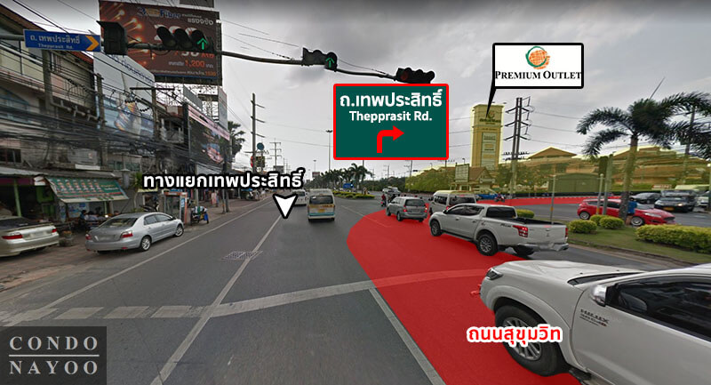 เลี้ยวขวาที่ ทางแยกเทพประสิทธิ์ เข้าสู่ ถนนเทพประสิทธิ์ (ตรงทางแยกขวามือจะเป็น พรีเมี่ยม เอาท์เล็ท พัทยา)