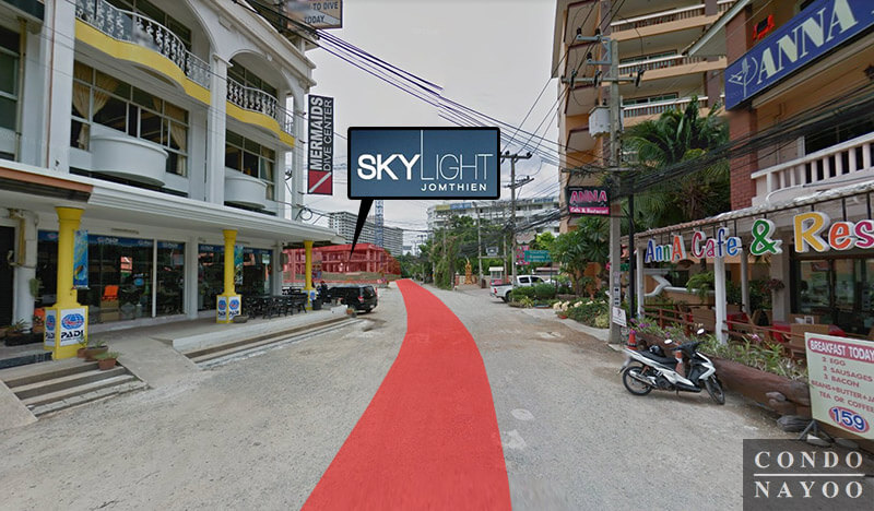 จาก ถนนทัพพระยา เลี้ยวซ้ายเข้าสู่ ซอยไม่มีชื่อ ระยะทางอีก 100 เมตร เลี้้ยวซ้ายเข้าโครงการ สกายไลท์ คอนโด จอมเทียน ถึงโครงการแล้วครับ
