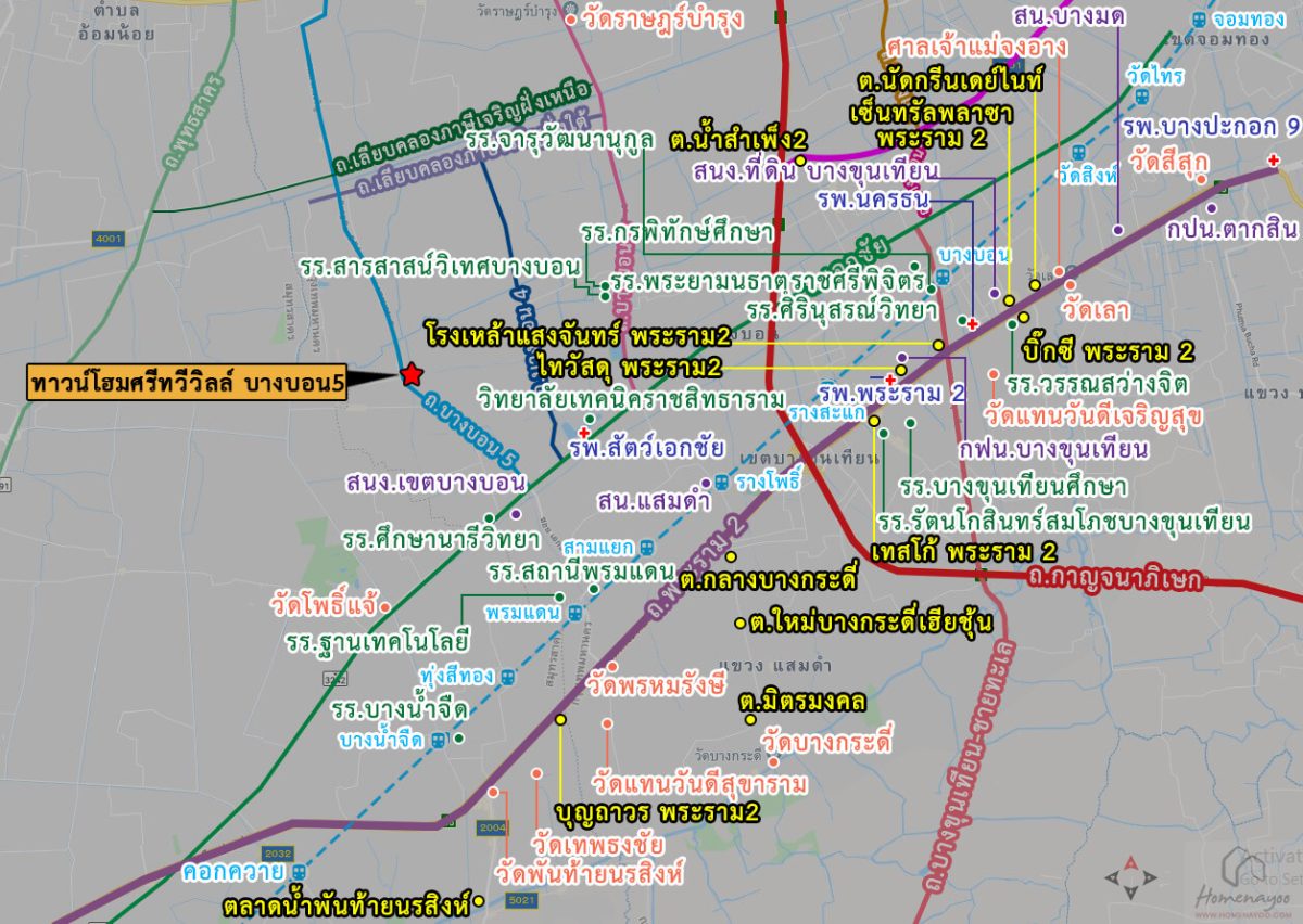 จากนั้นวิ่งตรงตาม ถนนบางบอน 5 ระยะทางอีก 2.6 กิโลเมตร เลี้ยวขวาเข้าสู่ บางบอน 5 ซอย 16 ถึงโครงการ ทาวน์โฮมศรีทวีวิลล์ บางบอน 5