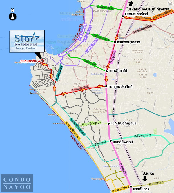 การเดินทางเริ่มจาก มอเตอร์เวย์ กรุงเทพ-พัทยา แยกมอเตอร์เวย์ ⇒ ถ.สุขุมวิท (ทล.3) ⇒ แยกเทพประสิทธิ์ ⇒ ถ.เทพประสิทธิ์ ⇒ ถ.ทัพพระยา ⇒ ถ.พระตำหนัก ⇒ ถ.เกษตรสิน ⇒ ซ.เกษตรสิน 4 ถึงโครงการ Star Residence @Cosy Beach