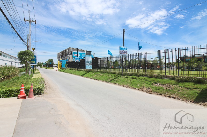 ตอนนี้เราอยู่ที่บริเวณซุ้มทางเข้าโครงการค่ะ เดี๋ยวเราจะทำการเดินสำรวจบริเวณโดยรอบโครงการด้วยกันเลย จะได้รู้ว่ามีอะไรอยู่แถวนี้บ้าง ที่ฝั่งตรงข้ามกับตัวโครงการก็คือหมู่บ้านเอสเกต