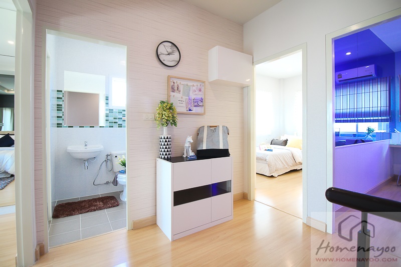 ฝั่งซ้ายมือของโถงบันไดคือห้องนอนใหญ่ ตรงกลางโถงคือห้องน้ำชั้นบน ฝั่งขวามือคือห้องนอน 2 และห้องนอน 3