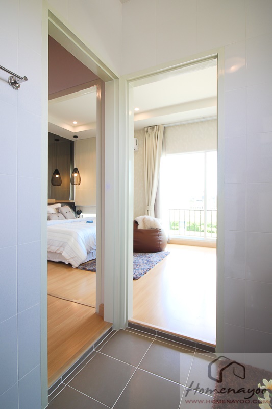 ทางโครงการวางเตียงนอนขนาด 5 ฟุตให้ดูเป็นตัวอย่าง แต่พื้นที่ห้องใหญ่พอสำหรับเตียงนอนขนาด 6 ฟุตเลยนะ และยังเหลือพื้นที่สำหรับวางโต๊ะข้างได้ทั้ง 2 ฝั่งด้วย