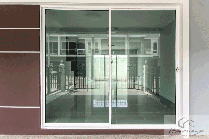 ประตูที่เปิดออกสู่ระเบียงก็เป็นประตูบานเลื่อนสลับเหมือนกับประตูภายนอกโดยทั่วไปของบ้าน และมีบานเลื่อนมุ้งลวดติดตั้งให้ทางด้านในอีกเช่นเคย แต่ประตูบานนี้จะมีธรณีที่ยกสูงจากพื้นขึ้นมาประมาณ 20 ซม. ซึ่งก็ไม่ใช่ความสูงที่สูงจนเกินไปถึงขั้นเข้าออกได้ลำบาก แต่ก็อย่าลืมระมัดระวังกันด้วย