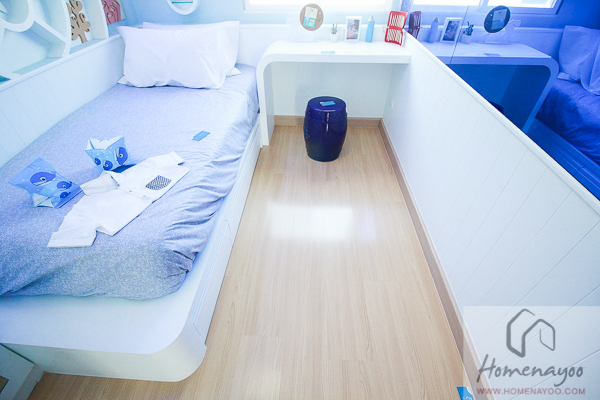 เข้ามาภายในห้องในบ้านตัวอย่างจัดเป็นห้องนอนเด็ก ตกแต่งด้วยธีมท้องทะเล