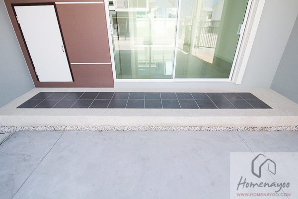 ออกมาดูพื้นที่ระเบียงด้านนอก พื้นระเบียงจะปูด้วยกระเบื้องเซรามิคขนาด 30 x 30 เซนติเมตร และลดระดับลงไปประมาณ 15 เซนติเมตร ราวกันตกเป็นเหล็กทำสีน้ำตาลเข้ากับรั้วบ้าน