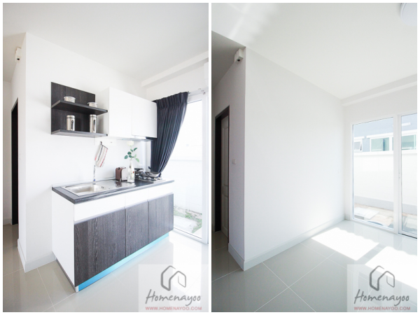 ถัดจากห้องรับแขกเข้าไปจะเป็นส่วนของห้องครัวและห้องทานอาหาร ซึ่งในบ้านของโครงการนี้จะไม่มีแบ่งพื้นที่ครัวมาให้ เพราะฉะนั้นสำหรับครอบครัวที่อยู่เป็นประจำและทำครัวหนักบ่อยๆ ก็แนะนำให้กั้นห้องครัวเพิ่มหรือจะต่อเติมพื้นที่หลังบ้านให้เป็นครัวไทยก็เป็นทางเลือกที่ดีค่ะ เพื่อที่จะได้ลดกลิ่นควันที่จะฟุ้งเข้ามาติดเฟอร์นิเจอร์และผ้าม่านส่วนอื่นๆของบ้านค่ะ