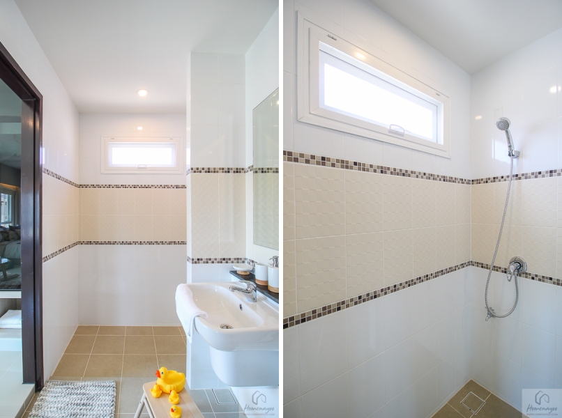 ห้องน้ำจะอยู่คั่นกลางระหว่างห้องนอน 2 ห้อง ภายในห้องน้ำแบ่งพื้นที่ส่วนเปียกส่วนแห้ง