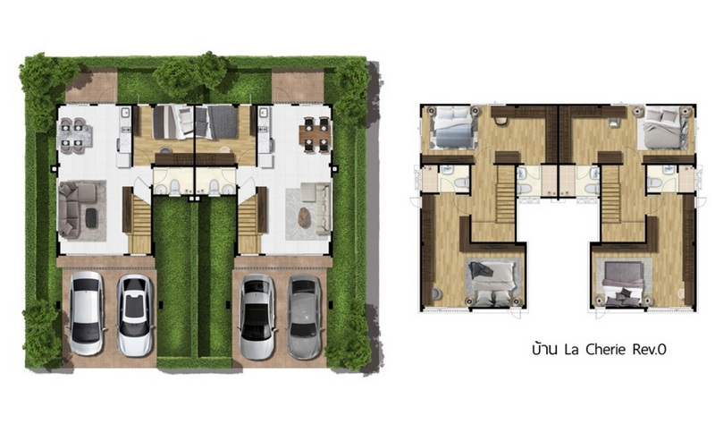 • La Cherie บ้านแฝด 2 ชั้น พื้นที่ใช้สอย 141 ตร.ม. ฟังก์ชัน 3 ห้องนอน, 3 ห้องน้ำ, 2 ที่จอดรถ