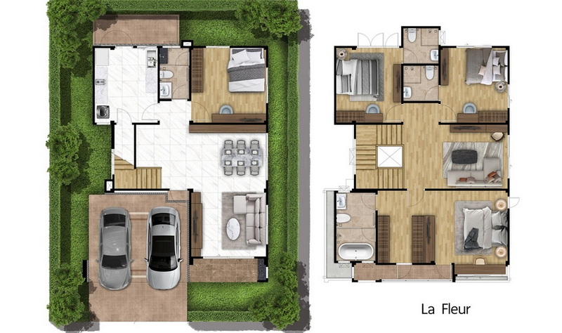 • La Fleur บ้านเดี่ยว 2 ชั้น พื้นที่ใช้สอย 210 ตร.ม. ฟังก์ชัน 4 ห้องนอน, 4 ห้องน้ำ, 2 ที่จอดรถ