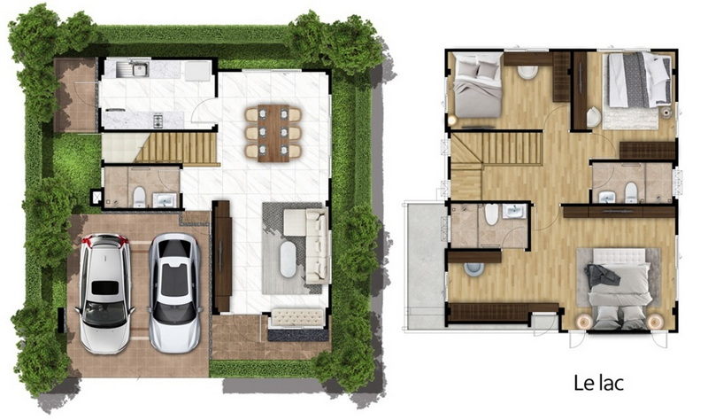• La Lac บ้านเดี่ยว 2 ชั้น พื้นที่ใช้สอย 153 ตร.ม. ฟังก์ชัน 3 ห้องนอน, 3 ห้องน้ำ, 2 ที่จอดรถ