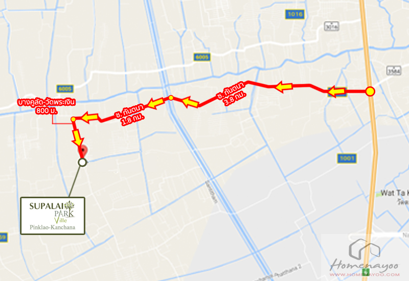 พอเข้าซอยกันตนาแล้วให้ขับตรงไป > ข้ามสะพานและไฟแดง > เลี้ยวซ้ายเข้าบางคูลัด – วัดพระเงิน > บางคูลัด – วัดพระเงิน > ศุภาลัย พาร์ควิลล์ ปิ่นเกล้า – กาญจนาฯ