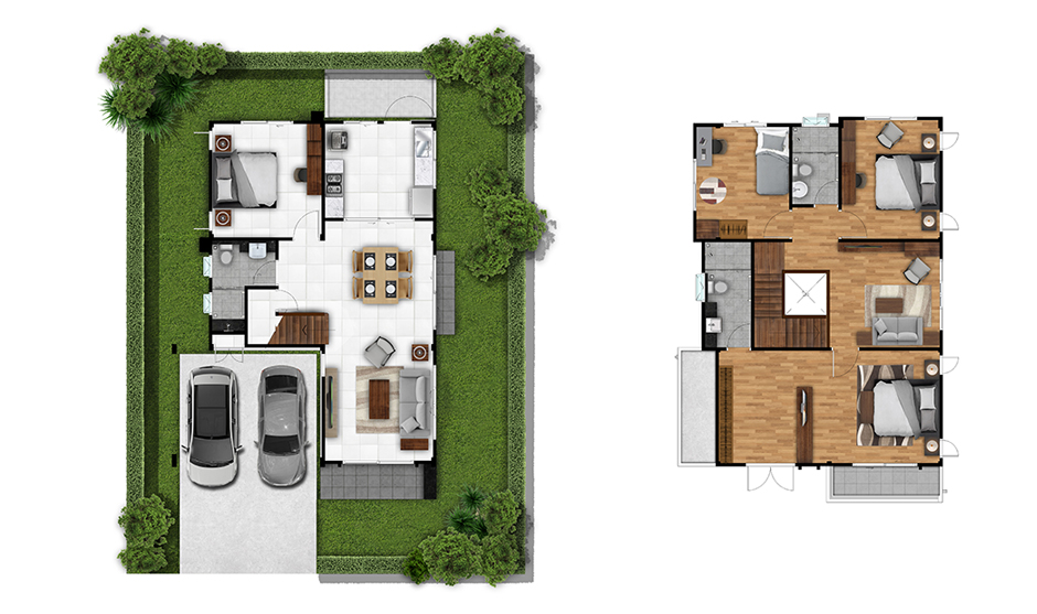 แปลนชั้น 1 เริ่มจากหน้าบ้านมีพื้นที่จอดรถให้ 2 คันในร่ม ส่วนทางเข้าหลักอยู่ที่เฉลียงหน้าบ้าน ภายในบ้านมีการวางแปลนแบบ Open Plan ส่วนแรกเป็นห้องนั่งเล่นและห้องรับประทานอาหาร เชื่อมต่อกับโถงทางเดินไปยัง ห้องครัว, ห้องนอนชั้นล่าง, ห้องน้ำชั้นล่าง และโถงบันได โดยห้องครัวเป็นครัวปิด มีขนาดใหญ่สามารถใช้เป็นครัวไทยได้เลยโดยไม่ต้องต่อเติมเพิ่ม และหลังบ้านก็จะมีลานซักล้างขนาดใหญ่ เชื่อมต่อกับห้องแม่บ้านพร้อมห้องน้ำแยกส่วนกับเจ้าของบ้าน พื้นที่แต่ละส่วนสามารถวางเฟอร์นิเจอร์พอสำหรับ 5 – 7 คน เหมาะสมสำหรับครอบครัวขนาดกลาง – ใหญ่ค่ะ