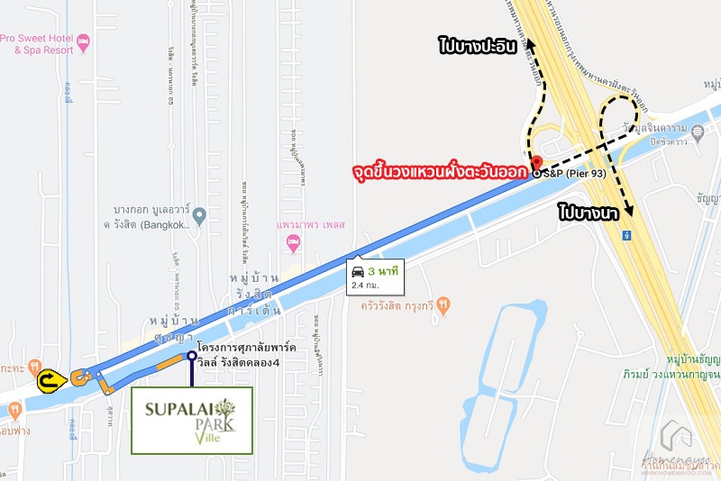 วงแหวนกาญจนาภิเษก > ถนนรังสิต – นครนายก > สะพานสินทรัพย์ > ซอยชุมชนสินทรัพย์ > Supalai Park Ville รังสิต คลอง 4